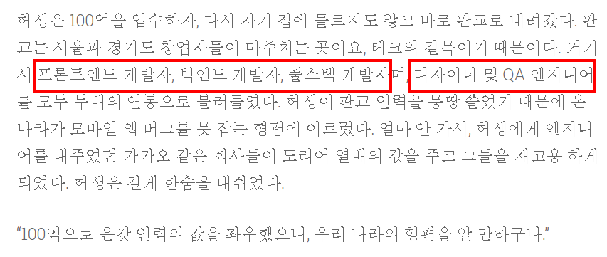 허생은 100억을 입수하자, 다시 자기 집에 들르지도 않고 바로 판교로 내려갔다. 판교는 서울과 경기도 창업자들이 마주치는 곳이요, 테크의 길목이기 때문이다. 거기서 프론트엔드 개발자, 백엔드 개발자, 풀스택 개발자며, 디자이너 및 QA 엔지니어를 모두 두배의 연봉으로 불러들였다. 허생이 판교 인력을 몽땅 쓸었기 때문에 온 나라가 모바일 앱 버그를 못 잡는 형편에 이르렀다. 얼마 안 가서, 허생에게 엔지니어를 내주었던 카카오 같은 회사들이 도리어 열배의 값을 주고 그들을 재고용 하게 되었다. 허생은 길게 한숨을 내쉬었다.