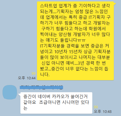 하지만 스타트업 업계 밖에서 활동하고 있는 IT업계에서 활동하고 있는 선배들의 얘기를 듣고 내가 IT사이드프로젝트 커뮤니티를 운영하면서 IT업계 인력 구조와 스타트업의 구인의 관계에 대해서 기이함을 느끼게 되었다. 국비학원에서 양산되는 개발자들과 중급이 없는 기획자들......
