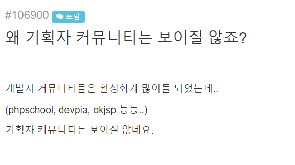 IT기획자 커뮤니티 중 가장 크지 않을까 싶다. 최대 규모인 만큼 구인구직 그리고 강의 관련된 정보들이 가장 많이 올라가고 자유로운 얘기들이 오고 가는 것 같다. 하지만 약간 old한 느낌이고 이미 오프라임으로 만났거나 아는 사람들끼리만 소통하는 것 같은 느낌....