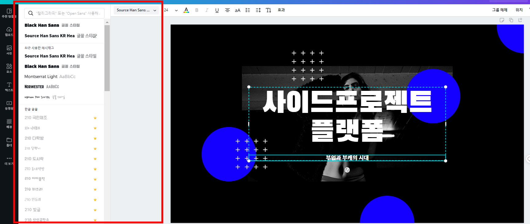 망고보드랑 타일이랑 또 비교하게 되는데 이쁜 폰트를 사용하려고 하면 폰트만 따로 유료 구매를 하게끔 하는 부분들도 있는데 캔바는 해외 사이트인데도 이쁜 무료 한글 폰트들이 꽤 많다.