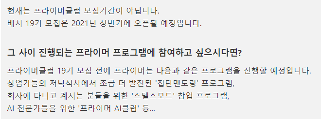 지금 프라이머클럽18기에 지원하세요.(지원서 제목이나 사업 소개글에 (스텔스모드창업)이라고 적어두면 좋겠죠?)