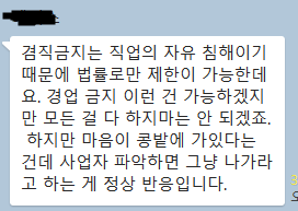 두번째로 지인 노무사분께 들었던 내용인데요. 너무 확신은 가지지 않으셨으면 좋겠지만 직업 자유의 침해 덕분에 동종업계 이동 제한이라던가 겸업 금지 등은 법률적으로 효과가 없다고 들었습니다. 저도 HR쪽을 하고 있긴한데 법률쪽은 전문 분야가 아니다보니 확신을 가지고 얘기해드리기는 좀 그렇긴하네요. 대신 글을 하나 링크를 걸어두겠습니다.