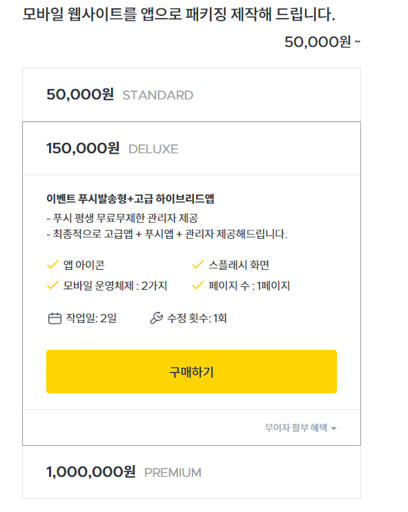 판매가격:99,000원, 30년 경력 개발자입니다.하이브리드앱으로 Android와 iOS 앱 제작이 가능합니다.1. 하이브리드앱 패키징기존 모바일웹을 하이브리드앱으로 패키징하여 스토어에 출시해드립니다.
