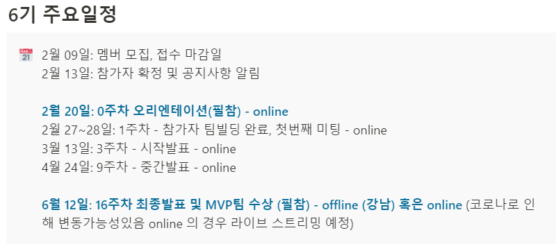해당 참가비는 프로젝트 최소 운영 비용과, 프로젝트 이후 우승팀(MVP 팀 선정)에게 상금으로 지급됩니다(5기 MVP팀 상금은 70만원이었습니다. 6기 MVP 상금 금액은 참가 인원수에 따라 변동될 수 있습니다).