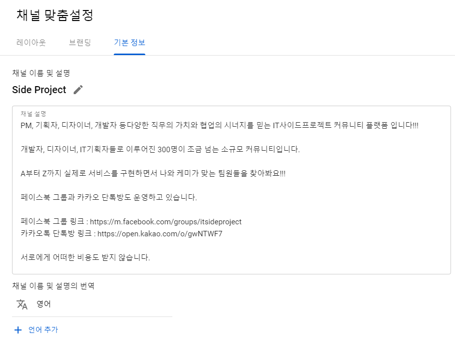 그나마 억지로 연관을 지으면 저희가 IT사이드프로젝트를 주로 하다보니깐 IT교육업계인 패스트캠퍼스의 체널을 참고했는데요. 아래에 있는 텍트트 의미가 패스트 캠퍼스의 교육 철학을 잘 보여주는 것 같아서 멋있는 것 같습니다. 하지만 저는 5분 뚝딱철학 처럼 Side Project라고 하면 딱히 생각나는 상징물을 아직 찾지 못하고 패스트캠퍼스처럼 멋있게 카피라이팅도 할 줄 몰라서 Canva랑 망고보드를 뒤져서 그나마 제 마음에 드는 것을 찾았습니다. 개인적으로 컨셉이 잘 보이지 않는 것 같아서 많이 아쉽네요. (나중에 바꿀꺼에요 ㅠㅠ 저처럼 처음해보시는 분들은 아래 2가지에 더 신경쓰세요.)
