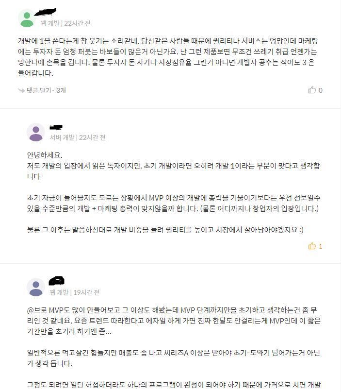 아마도 개발자 버전은 쓰지 않을 것이다. 며칠 전에 개발자 출신이 스타트업을 하고 싶다며 조언을 구했을 때도 대놓고 얘기했다. 개발자가 창업에 유리한 포지션은 아니라고.... 그래도 그 개발자분은 혼자서 쇼핑몰도 운영하고 마케팅하고 광고도 스스로 공부를 하신 분이라 잘 되지 않을까 싶다. 스타트업은 초기 포지셔닝의 영향을 많이 받기 때문에 오히려 마케팅이나 광고 시장에서 더 유리한 부분도 있으니깐 다른 사업을 하셨던 분이라면 더 쉽게 할 수 있을 거다. 이 정도 얘기만 했다.